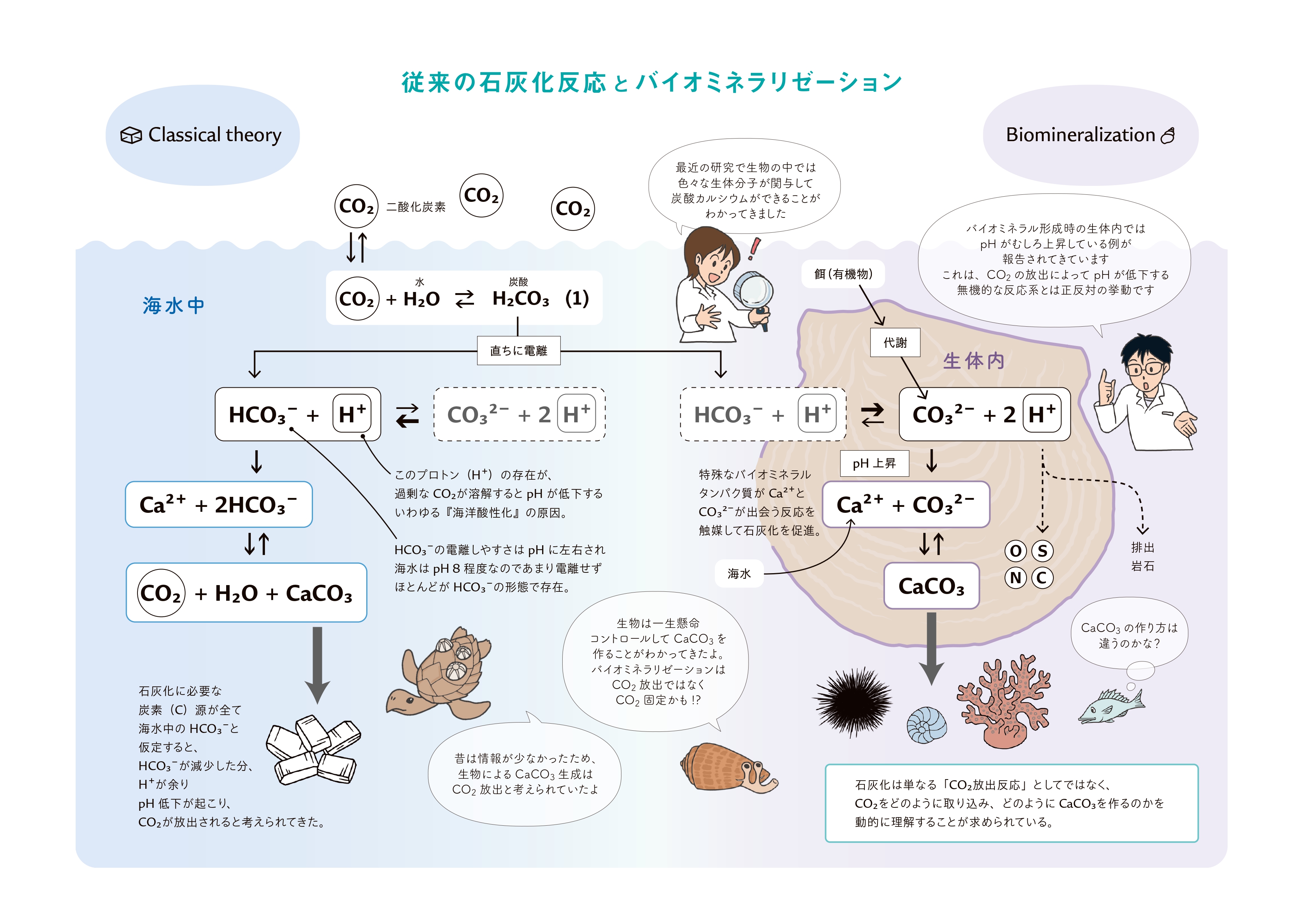 近年、人間活動によって大気中の二酸化炭素(CO2)濃度が上昇することで、地球温暖化や海洋酸性化などの様々な環境変動を引き起こされています。このような状況で、様々なCO2固定化法が検討されています。多くのバイオミネラルは炭酸塩鉱物であり、CO2固定とも密接な関係があるように思えますが、バイオミネラリゼーションによるCO2固定プロセスは、これまでほとんど注目されてきませんでした。CO2が海水に溶けると水和してH2CO3となり、直ちに電離してH+とHCO3-となります。この反応において発生するプロトン(H+)の存在が、CO2が溶解するとpHが低下する、いわゆる『海洋酸性化』の原因です。HCO3-は、さらにH+とCO32-に電離するものもありますが、海水はpH